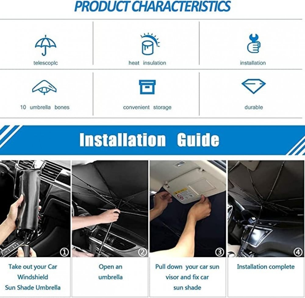 مظلة سيارة صغيرة الحجم وسهلة التطبيق تعمل على عزل حرارة وأشعة الشمس والمحافظة على برودة المقاعد والدركسون كما تساهم بخفض حرارة السيارة لمساعدة المكيف على التبريد.