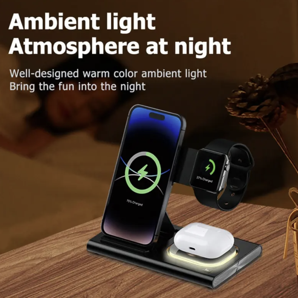 – محطة شحن قابلة للطي: توفر مساحة على طاولة الليل أو مكتب العمل.