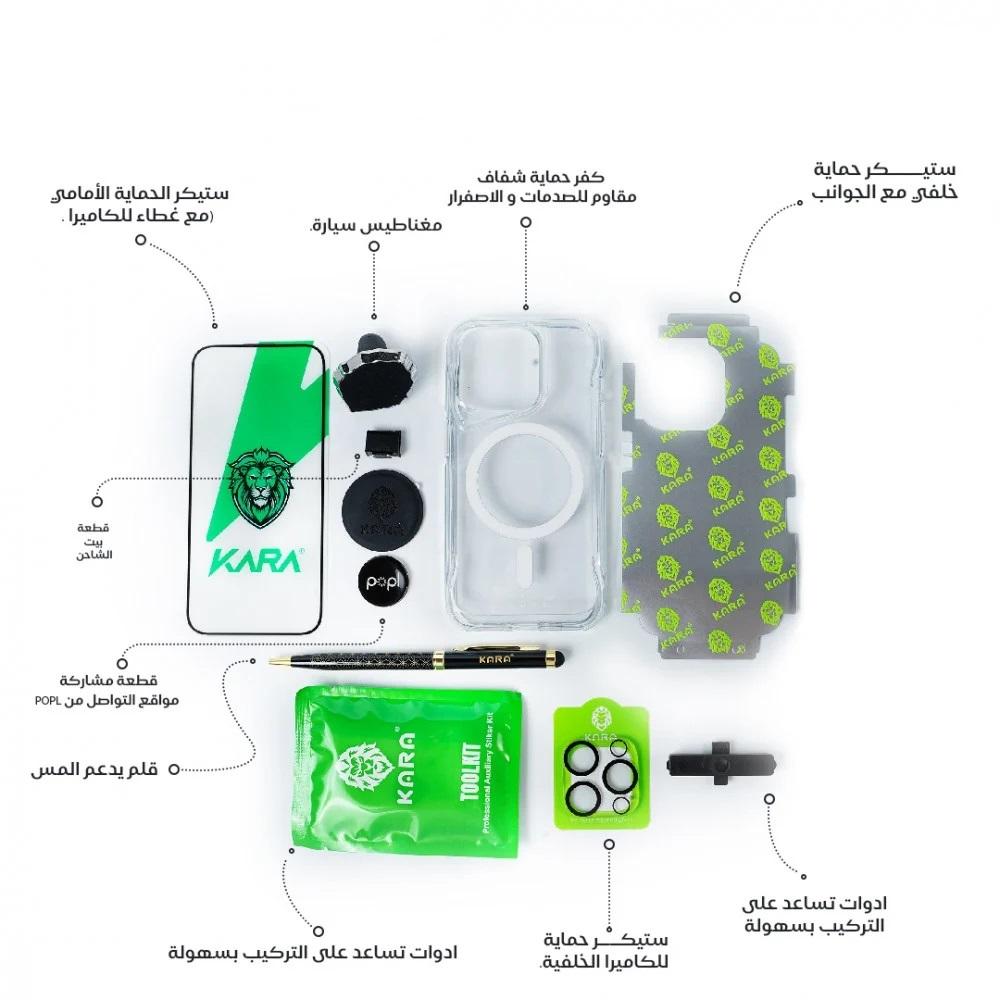 احصل على بكج الحماية المضاعف من كارا 12 في 1 لأيفون 15، 15 برو، و15 برو ماكس، يوفر حماية كاملة من البصمات، الخدوش، والصدمات.